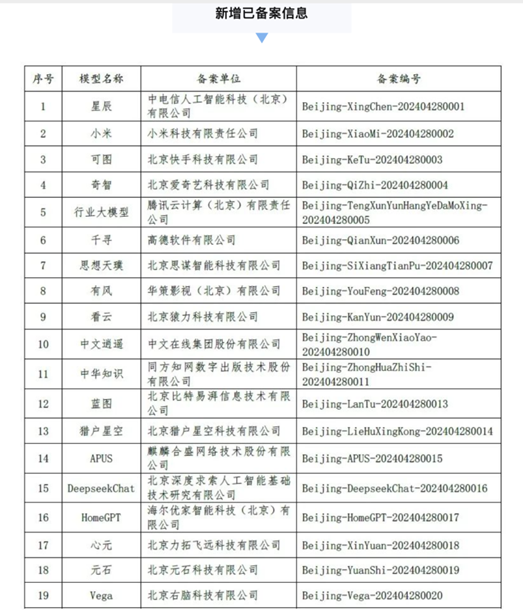 5月15日,“网信北京”公布人工智能备案新进展,19家企业新增备案,其中包括小米科技有限责任公司“小米”、北京猿力科技有限公司“看云”、北京快手科技有限公司“可图”、腾讯云计算(北京)有限责任公司“行业大模型”、高德软件有限公司“千寻”等。